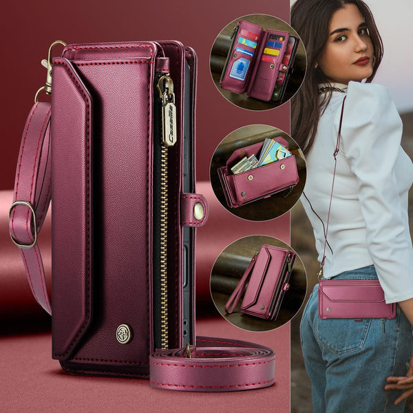 Simplify your life with the Caseme C36 Wallet Cover. This super functional case seamlessly combines protection for your phone with the convenience of a wallet. Crafted from premium materials, it offers a luxurious feel while safeguarding your device from everyday wear and tear. Inside, discover thoughtfully designed card slots to securely hold your essentials, eliminating the need for a separate wallet. A dedicated cash compartment provides ample space for bills, making it perfect for on-the-go convenience. The case's magnetic closure ensures your belongings stay securely in place, while precise cutouts grant easy access to all phone functions. Beyond functionality, the Caseme C36 prioritizes style. Its modern design complement your phone's aesthetic, elevating your overall look. With the included shoulder strap and wrist lanyard you can carry the wallet in a variety of ways Experience the perfect blend of protection, organization, and style with the Caseme C36 Wallet Cover.