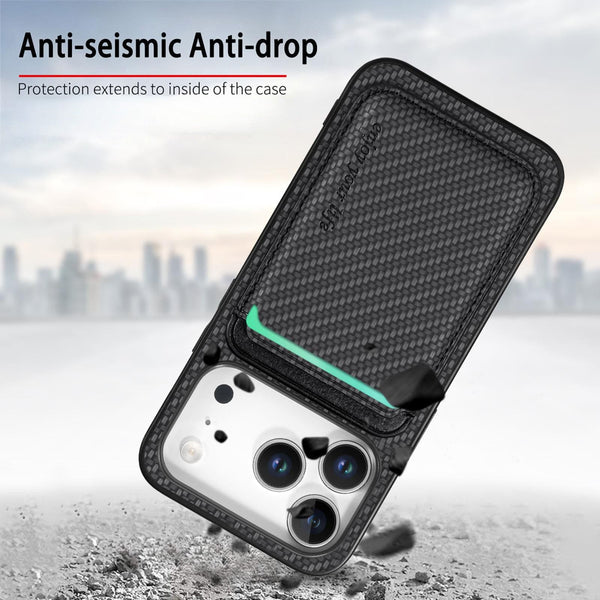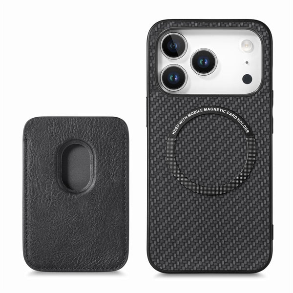 Carbon Fiber Patterned MagSafe Cover with Removable Card Wallet – iPhone 17 Pro Elevate both style and functionality with the Carbon Fiber Patterned MagSafe Cover, designed exclusively for the iPhone 17 Pro. Its standout feature is the removable magnetic card wallet, giving you the flexibility to carry your essentials with ease while keeping your phone slim and sleek. The cover is equipped with a MagSafe metal ring on the back, enabling quick attachment to MagSafe chargers, holders, and other accessories. It also works seamlessly with magnetic car mounts, ensuring a secure and convenient setup for navigation on the go. Built to protect as well as impress, the case combines a durable carbon fiber patterned back panel with shock-absorbing TPU edges to guard against drops, bumps, and everyday wear. Raised bezels and a reinforced camera surround provide extra protection for your phone’s screen and lenses, so you can place it face down with confidence. Key Features: