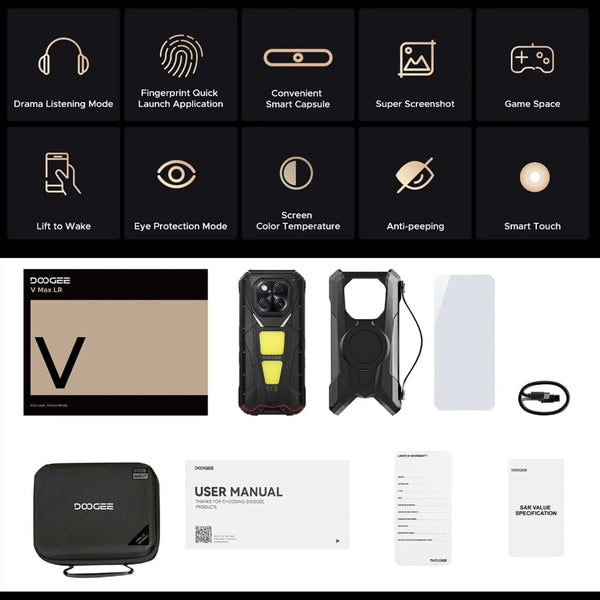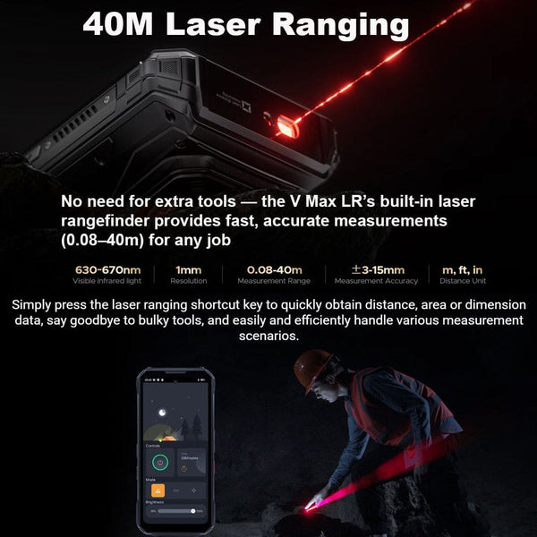 VIP Edition - Includes Rear Magsafe Protective Cover, Phone Stand, Carry Case Built for those who demand more from their gear, the DOOGEE V Max LR combines extreme durability with professional-grade tools. Whether you're on a remote job site or deep in the wilderness, this rugged powerhouse is designed to keep you connected and productive when standard phones can't keep up. ποΈποΈ Professional Laser Ranging: The built-in 40m laser rangefinder allows you to measure distances, areas, and volumes with a single click. πβ¨ Massive 20,500mAh Battery: Go days without a charge. With 45W max fast charging and 10W reverse charging, it doubles as a portable power bank for your other devices. ππ Pro-Grade Photography: Capture every detail with a 200MP main camera and see through total darkness with the 20MP Night Vision lens. πΈπ Extreme Durability: Rated IP68/IP69K and MIL-STD-810G, it is fully sealed against water, dust, and drops. π‘οΈπ¦ Outdoor Utility: Stay visible with 1200LM dual camping lights and be heard in noisy environments with the 130dB high-volume speaker. π¦π Fast 5G Performance: Powered by the MediaTek Dimensity 7300 and Android 15, enjoy smooth multitasking and ultra-fast connectivity. ππΆ Specifications: