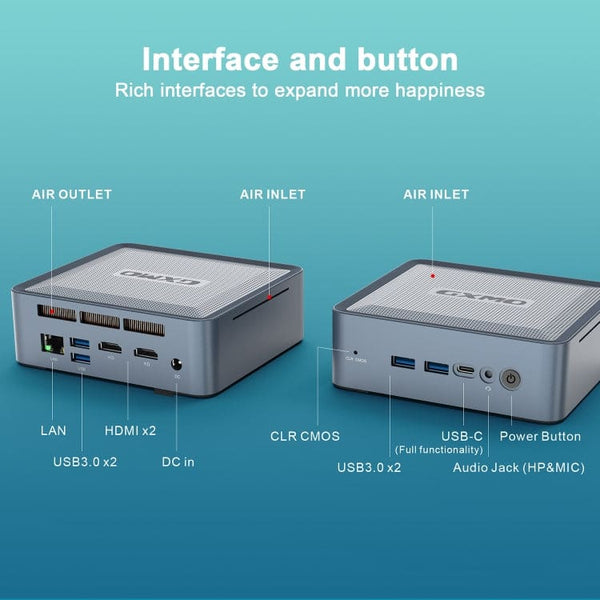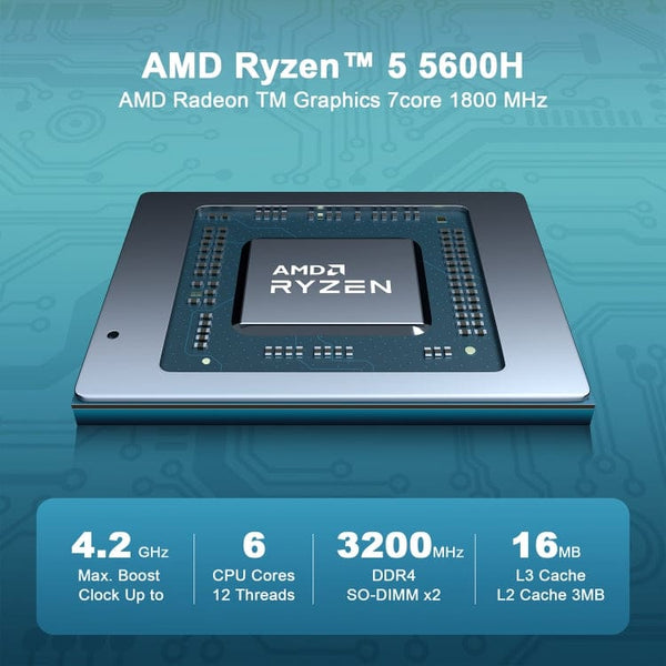 The GXMO H56 Mini PC packs a serious punch into a chassis small enough to fit in the palm of your hand, making it the perfect desktop replacement for your home office, entertainment center, or industrial application. Powered by the high-performance AMD Ryzen 5 5600H processor (6 Cores, 12 Threads) and integrated AMD Radeon Graphics, this mini desktop delivers desktop-grade speed and efficiency for demanding multitasking, high-definition streaming, and casual gaming without taking up valuable space. Equipped with 16GB of DDR4-3200M RAM and fast 512GB NVMe PCIe SSD, the H56 ensures quick boot times and rapid loading of applications and large files. The system runs Windows 11 Professional and supports the Ubuntu operating system. Its robust thermal design keeps the powerful components cool, maintaining peak performance whether you're compiling code or enjoying 4K video playback. Connectivity is a breeze with this compact powerhouse. It features two HDMI ports and Type-C video for triple screen support, one Gigabit Ethernet (RJ45) port, and a versatile USB Type-C port. You get four USB 3.0 ports, ensuring you can connect all your keyboards, mice, and external drives. Wirelessly, the integrated WiFi 6E and Bluetooth 5.2 module provides next-generation network speed to all your accessories. Despite its tiny footprint (126 x 112.8 x 40mm), the GXMO H56 is built for future growth. It includes an internal connector for an additional 2.5-inch SATA HDD, allowing you to easily expand your storage for large media libraries or backups.