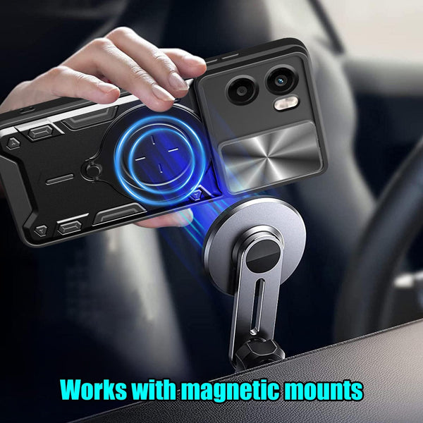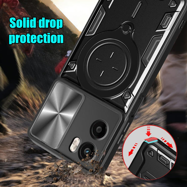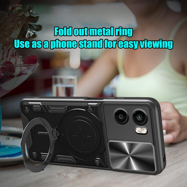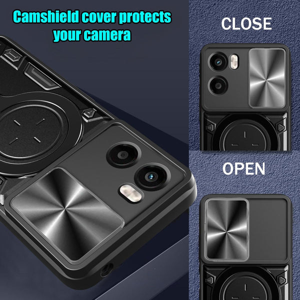 Introducing the Camshield cover protection for your Motorola Moto G05 . Made from a solid polycarbonate rear panel and rigid frame this cover provides solid protection against scratches and bumps. The cover comes with a sliding camera cover to protect your camera. The cover has clear edges so light can shine through to indicate incoming calls and notch locks into the closed position so it doesn't slide open A large metal ring folds and rotates from the back of the cover, providing a grip ring and a phone stand for hands free viewing. The metal patch allows mounting the phone on a magnetic mount Get the protection your phone deserves, designed to keep your Motorola Moto G05 safe and secure.