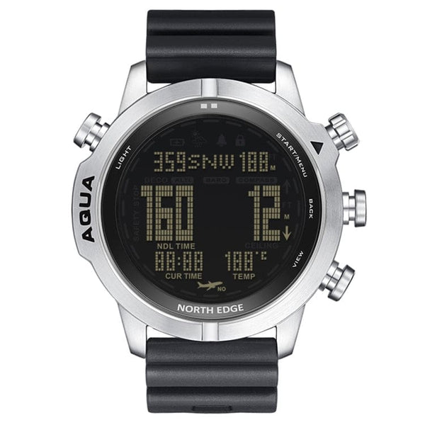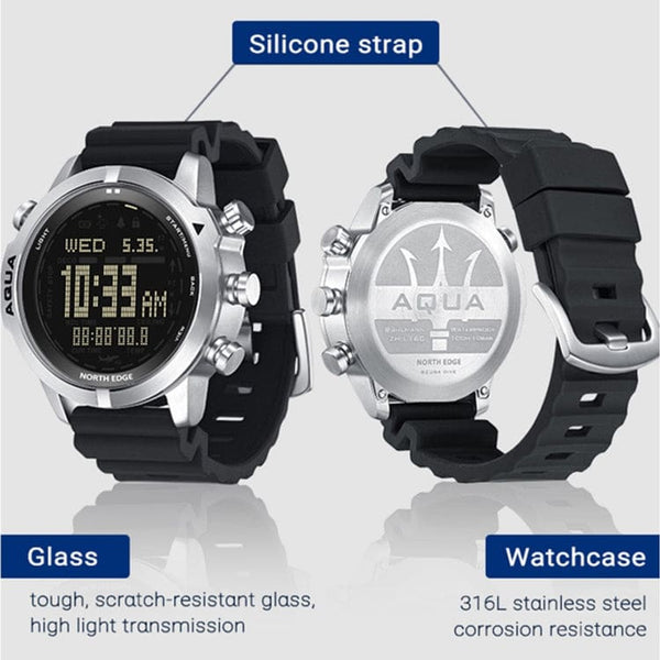 The NORTH EDGE AQUA Smart Watch is the essential dive computer and rugged adventure companion, engineered for those who demand performance both above and below the surface. Built with a robust design, this timepiece features an impressive 100-meter waterproof rating (10ATM), making it a reliable instrument for scuba diving and intensive water sports in extreme aquatic environments with dive specific functions (Preparation, Compass, NDL, Depth, Surface etc) Equipped with critical outdoor features, the AQUA ensures you are always oriented and aware of your surroundings. It includes a dedicated Compass Mode for essential navigation, alongside built-in Altimeter and Barometer functions to track changes in altitude and pressure—making it equally valuable for hiking and climbing. A crucial safety feature is the powerful luminous display, which ensures the time and all vital data remain clearly visible, even in extremely dark underwater or low-light conditions. The durability of the NORTH EDGE AQUA is guaranteed by its quality component selection, including corrosion-resistant 316L stainless steel, a resilient silicone strap, and tough, scratch-resistant glass with high light transmission. This combination ensures maximum longevity and comfort, no matter how demanding the activity. Measuring 4.7 x 1.5 cm, this high-performance instrument is powered by a reliable CR2450 battery, offering ease of maintenance. The NORTH EDGE AQUA is designed to be your most trustworthy piece of gear for any demanding adventure, from the deepest dives to the highest peaks. Main Features Note: The is an outdoor/adventure stand alone watch - it is not a 'smart watch' and does not connect to your phone
