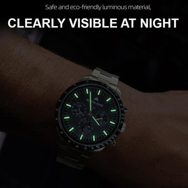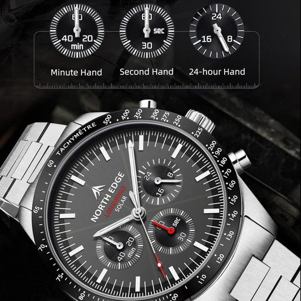 The NORTH EDGE LONGWINGS is the ultimate timepiece engineered for the modern outdoor enthusiast. Combining rugged durability with cutting-edge solar technology, this watch is designed to keep up with your adventurous lifestyle without ever needing a battery change. Its striking Black Silver finish, paired with a premium 316 stainless steel case and strap, ensures you look sharp whether you're on the trail or in the city. Harness the power of the sun with the LONGWINGS' highly efficient solar-powered movement. This advanced solar charging technology provides exceptional, long-lasting battery life—up to an impressive 180 days on a full charge, giving you reliable performance on the longest expeditions. Focus on your journey, not on battery life. Built to endure the elements, the watch features a robust 316 stainless steel case and is protected by a hardened mineral glass crystal, offering superior resistance to scratches and impacts. Essential for aquatic activities, it boasts a 50-meter water resistance rating, making it suitable for swimming and surface water sports. The watch is crafted for comfort and size, featuring a 20mm band width and accommodating a maximum wrist circumference of 225mm. Furthermore, the luminous hands ensure you have crystal-clear time visibility, even in low-light conditions or the dead of night, cementing the NORTH EDGE LONGWINGS as a reliable, low-maintenance companion built for performance and style. Main Features Note: The is an outdoor/adventure stand alone watch - it is not a 'smart watch' and does not connect to your phone