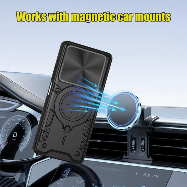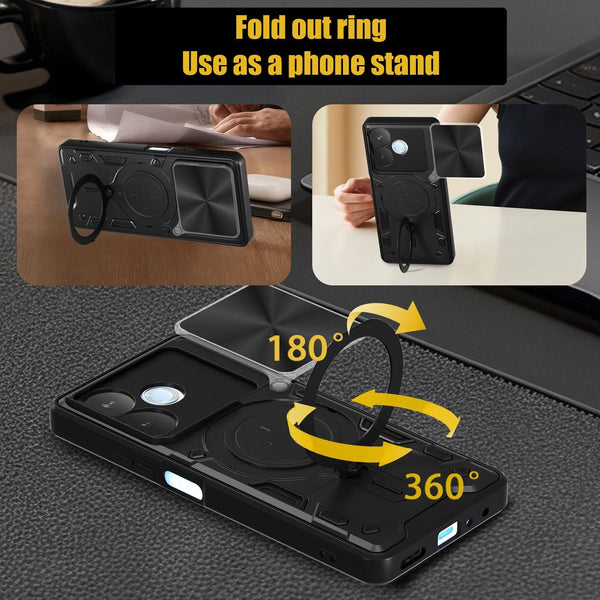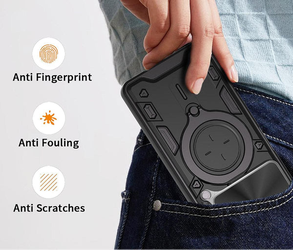 Introducing the Camshield cover protection for your Oppo A5 Pro . Made from a solid polycarbonate rear panel and rigid frame this cover provides solid protection against scratches and bumps. The cover comes with a sliding camera cover to protect your camera. The cover has clear edges so light can shine through to indicate incoming calls and notch locks into the closed position so it doesn't slide open A large metal ring folds and rotates from the back of the cover, providing a grip ring and a phone stand for hands free viewing. The metal patch allows mounting the phone on a magnetic mount Get the protection your phone deserves, designed to keep your Oppo A5 Pro safe and secure.