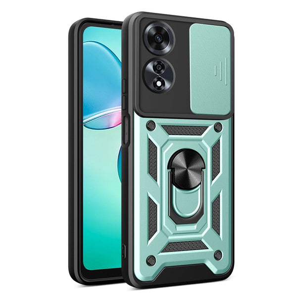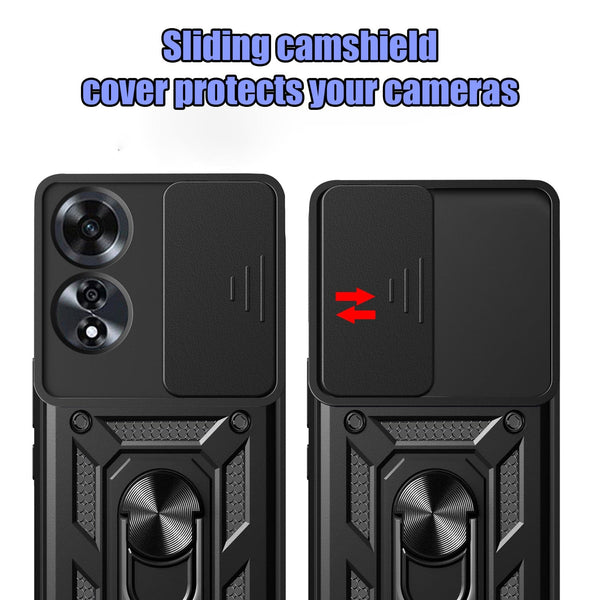 Introducing a sturdy phone case designed to safeguard your Oppo A60 from falls, scratches and bumps. The case features reinforced corners and rubber bumpers to absorb shock upon impact. With a sliding camera cover protection and raised bezels, your phone is well-protected from any damage. In addition to its protective features, this phone case also comes equipped with a rotating ring/stand with a metal patch. This feature doubles as a phone stand and works with magnetic car holders for convenience on the go. Made with high-quality TPU material and thickened edges, the case is shock-resistant, ensuring your phone stays intact even in the most demanding conditions. The metal patch on the stand allows you to securely attach your phone to a magnetic phone holder without any worry of slipping. This case is the perfect combination of style and functionality for your Oppo A60.
