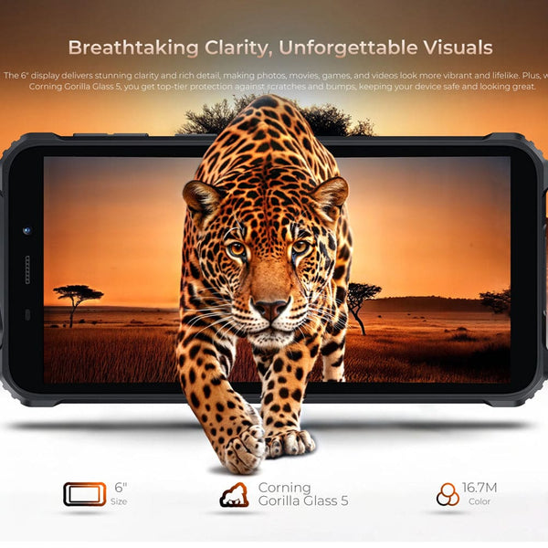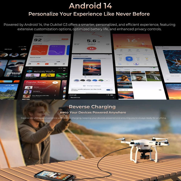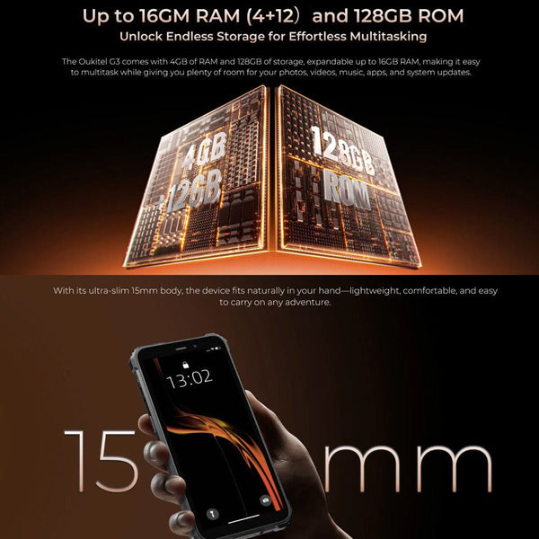 The OUKITEL G3 is the ultimate value rugged smartphone built for the extreme outdoors and demanding jobs. The G3 boasts IP68, IP69K, and MIL-STD-810H certifications, guaranteeing exceptional resistance to complete dust ingress, water immersion and reliable shock resistance. The G3 runs on the efficient Android 14 operating system. This specific model is configured with 4GB of physical memory supplemented by 12GB of virtual expansion RAM, paired with a substantial 128GB of internal storage. The storage can be expanded up to 1TB via an optional microSD card. Powering your excursions is a 6300mAh battery, providing extended usage times on a single charge. The device supports OTG reverse charging functionality, allowing you to use your smartphone as a power bank to recharge other small electronic devices. Visuals are presented on a 6.0-inch HD+ display, which is protected by Corning Gorilla Glass 5 for defense against scratches and accidental drops. The OUKITEL G3 further enhances your experience with a versatile 13MP main rear camera and a 5MP front camera for clear photos and video calls. Connectivity is robust with 4G Dual SIM support, secure Face ID unlocking, a 3.5mm headphone jack for audio, and a high-precision 4-in-1 navigation system that includes GPS, GLONASS, Beidou, and Galileo. Its feature set is rounded out by a dedicated customizable button and a built-in outdoor toolkit with essential utilities like a compass and magnifier. NOTE: This phone package does NOT ship with a wall charger - Use your existing USB wall charger. Specifications: