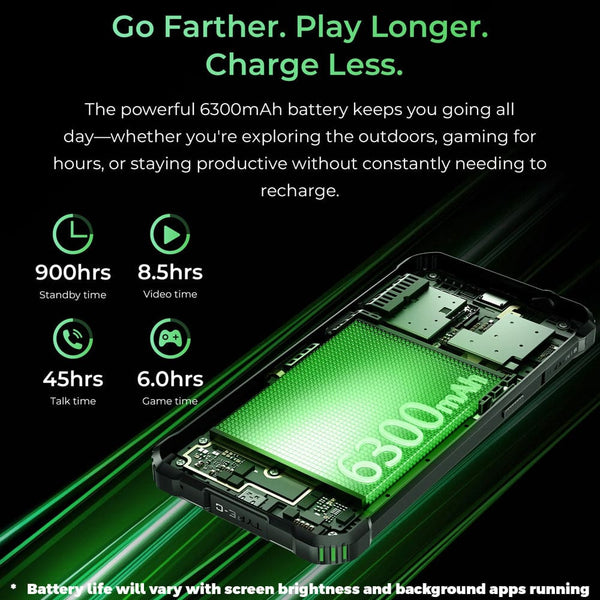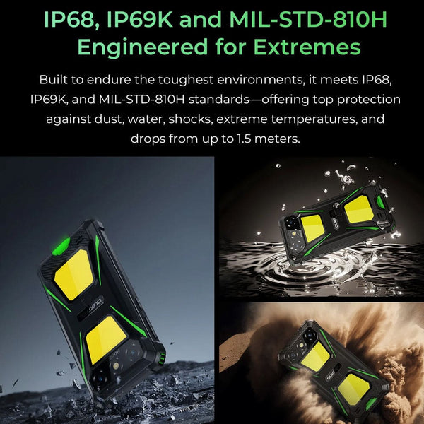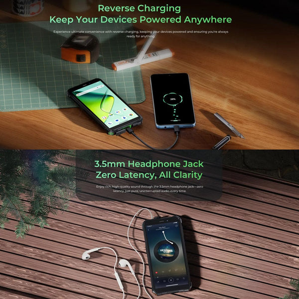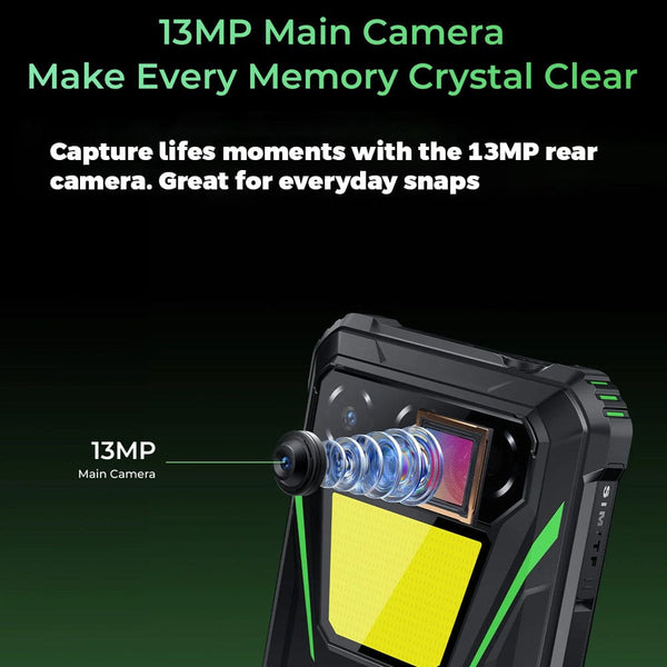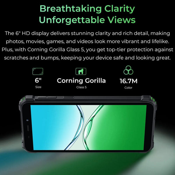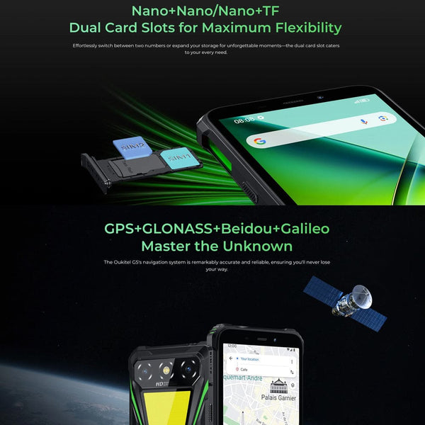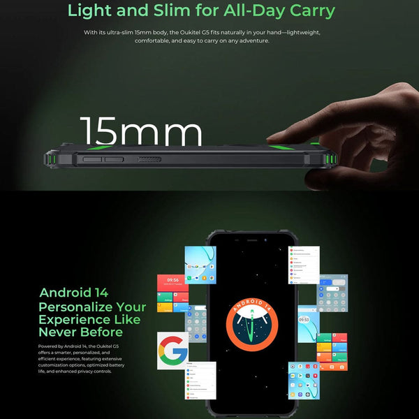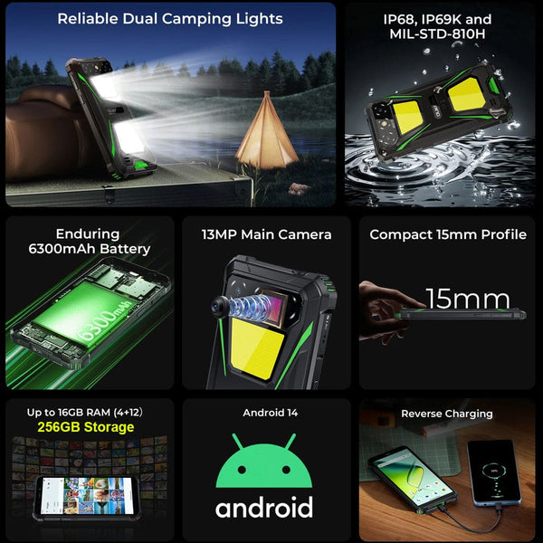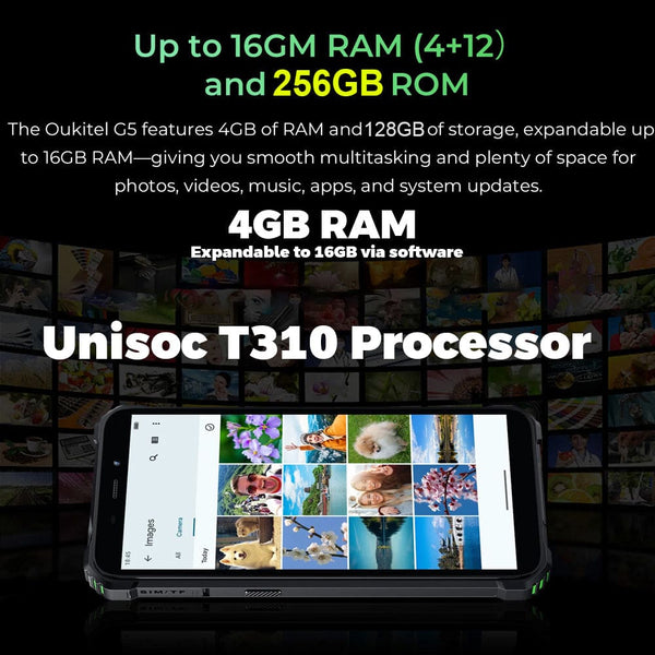 Elevate your outdoor experience with the Oukitel G5 Rugged Phone, a device engineered for endurance and adventure. This phone is not just a gadget; it's a reliable partner for those who thrive in demanding environments. Featuring a 6300mAh battery, the G5 ensures you stay connected and powered for extended periods. Say goodbye to the constant search for a power outlet and embrace the freedom of a long-lasting charge with reverse charging for other devices. Built to withstand the elements, the Oukitel G5 is rated with IP68, IP69K, and MIL-STD-810H standards, offering superior protection against dust, water, shocks, and extreme temperatures. Its robust construction ensures it can handle drops from up to 1.5 meters, making it the perfect companion for construction sites, hiking trails, and any challenging condition you encounter. The device is powered by a Unisoc T310 processor and comes with 4GB of RAM (expandable to 16GB via software) and 256GB of internal storage, providing a smooth and responsive user experience for essential tasks and ample space for all your photos and applications. The Oukitel G5 goes beyond basic smartphone functionality with its integrated dual camping lights. These high-lumen lights are designed to be your trusted source of illumination during nighttime activities, whether you're setting up a tent, navigating a trail, or facing an emergency in a remote location. The vibrant 6-inch HD display, protected by Corning Gorilla Glass 5, offers stunning clarity and durability, ensuring that your photos, videos, and apps look vivid and are safe from scratches. Experience durability and functionality with an everyday phone that’s ready for anything you are.