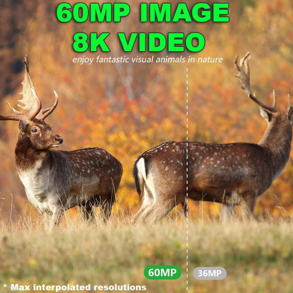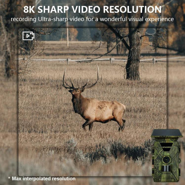 The PR-903W Wi-Fi Solar Powered Trail Camera, designed for the avid outdoors enthusiast and security-conscious homeowner alike. This revolutionary device captures every moment in stunning clarity, offering incredible 8K/4K/2.7K/1080P/720P video resolution with sound, and crystal-clear photos at resolutions up to 60MP. Equipped with a rapid 0.2-0.5 second trigger time and 120-degree sensing angle, you'll never miss a beat. The PR-903W boasts superior night vision capabilities, thanks to two powerful infrared lights providing a range of 15-20 meters. Its robust IP66 waterproof rating ensures reliable performance in any weather condition, from scorching heat to freezing cold, operating flawlessly between -20 to 60 degrees Celsius. Say goodbye to frequent battery changes with the integrated solar panel, which powers a 5200mAh lithium battery, offering extended periods of operation. For added convenience, it also supports 8xAA batteries (not included). Managing your footage is effortless with Wi-Fi connectivity and support for a 128GB SD card (not included), allowing you to easily view and download your captures. The intuitive 6-key one-handed operation makes setup and control a breeze. Other features are time lapse mode, burst shooting, audio recording, scheduled operation, date and time stamp and loop recording. Whether you're tracking game, monitoring your property, or simply observing nature, the PR-903W provides unparalleled performance and convenience. Each camera comes complete with a strap, USB power cable, USB data cable, and an instruction manual. SPECIFICATIONS