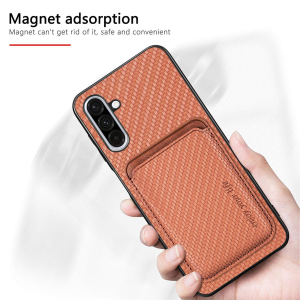 The standout feature of this Carbon Fiber Patterned Magsafe Cover with Removable Card Wallet is its removable card wallet, which attaches magnetically to the back. This sleek and stylish cover combines cutting-edge design with practical functionality to enhance your smartphone experience. Designed with convenience in mind, this cover also features a Magsafe metal ring on the back. This allows for seamless attachment of various magnetic accessories, such as Magsafe chargers or holders, providing a hassle-free charging and mounting experience. You can even attach it to magnetic car mounts for secure and convenient navigation while driving. In addition to its practical features, the Carbon Fiber Patterned Magsafe Cover offers exceptional protection for your Samsung Galaxy A56. The rigid back panel ensures strength and durability, safeguarding your device against accidental drops and impacts. The shock-absorbing TPU edges provide an extra layer of defense, reducing the risk of damage from everyday bumps and scratches. With raised bezels and a camera surround, this cover offers added protection for your phone's vulnerable areas. You can rest easy knowing that your Samsung Galaxy is shielded from potential damage to the screen and camera lenses, even when placed face down.