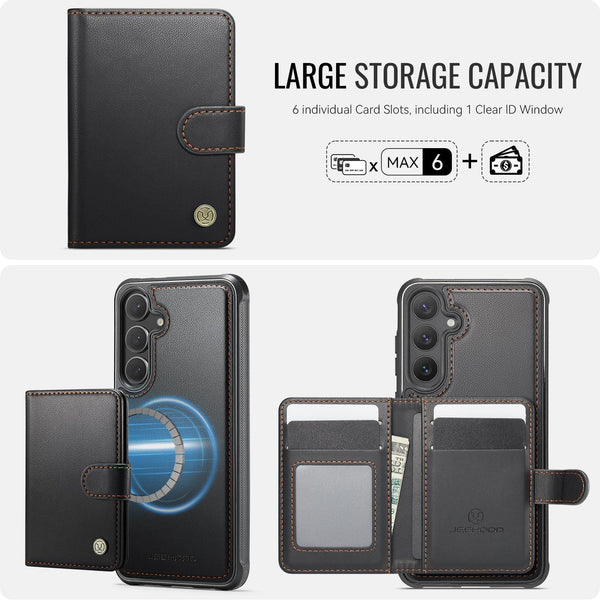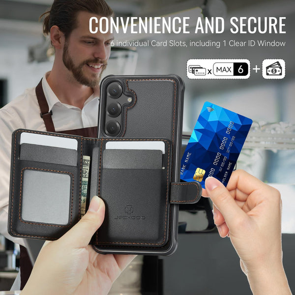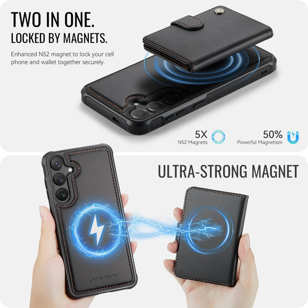 Step up your Samsung Galaxy S26 5G experience with the JH Series Magnetic Detachable Wallet Case. π± This isn't just a phone cover; itβs a versatile 2-in-1 tool designed to simplify your carry while providing heavy-duty protection. β¨ The core of this system is the Self-Aligning Magnetic Technology. π§² Simply bring the detachable wallet close to the back of the case, and strong magnets snap it perfectly into position every time. No more fumbling to find the right alignment! Built for durability, the case features a shockproof bumper frame with reinforced corners and a solid polycarbonate inner plate, all finished with a premium leather texture. π‘οΈ When you need a slim profile or want to use wireless charging, just pop the wallet off and you're good to go. β‘ With 4 dedicated card slots, you can keep your essential IDs and bank cards right where you need them. π³ The raised bevel edges provide that extra peace of mind, ensuring your screen and camera lenses stay guarded against life's unexpected drops. π