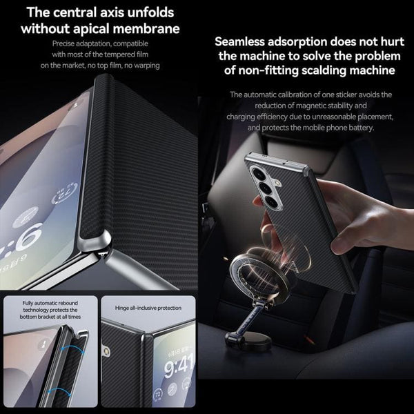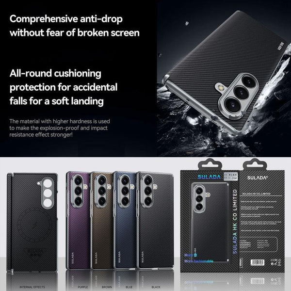 The SULADA Shockproof Case combines cutting-edge aesthetics with robust defense, featuring a distinct 600D Kevlar texture that gives it a sophisticated, tactile feel while offering superior grip. Constructed from a durable blend of PC (Polycarbonate) and metal materials, it ensures your device remains safe without compromising its slim profile. Protection is paramount, and this case delivers comprehensive safeguarding for your valuable phone. The resilient Kevlar-textured shell and tough material composition work together to fully shield your Galaxy Z Fold7 5G against daily hazards, including normal scratches, abrasive dirt, and general wear and tear. This shockproof design provides peace of mind, ensuring the device’s structure and aesthetics are preserved through continuous use. A key functional specification is the built-in magnetic ring, providing seamless integration with modern charging solutions. This feature ensures full compatibility with magnetic wireless charging, allowing for effortless power-ups without the hassle of removing the case. It’s designed for simplicity and efficiency, adding a layer of contemporary convenience to your mobile experience. The design maintains absolute precision, engineered specifically for the Galaxy Z Fold7 5G. Its accurate, precision-fit structure ensures that all elements of your device are accessible.Main Features