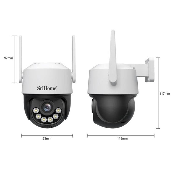 The Srihome SH072 is a professional-grade outdoor surveillance camera built to deliver uncompromising security with its stunning 8-megapixel (4K Ultra HD) resolution (3840 x 2160). Utilizing advanced H.265 compression, it ensures maximum clarity while optimizing video file size for efficient storage. Its durable, IP66 waterproof rating guarantees reliable performance and protection against harsh weather elements, making it the ideal guardian for your home or business, day and night. This powerful camera offers comprehensive coverage thanks to its PTZ (Pan-Tilt-Zoom) functionality, providing a wide 355° horizontal rotation and 90° vertical tilt, allowing you to monitor every corner remotely via your mobile device. Connectivity is seamless and stable with Dual-Band Wi-Fi support, connecting to the SriHome phone app to view and control the camera from anywhere in the world Intelligent security is at the core of the SH072, featuring built-in AI Auto-Tracking that detects and automatically follows human movement within the frame, coupled with Human Detection alerts. The camera also features two-way audio, thanks to an integrated microphone and speaker, allowing for real-time conversation or warning trespassers from afar. For continuous peace of mind, the camera provides versatile recording options. It supports local storage via a TF/SD card up to 256GB (memory card sold separately) for ample loop recording capacity, as well as an optional cloud storage service. Furthermore, advanced night vision capability offers three modes, including Full-Color Night Vision using powerful warm lights, ensuring detailed, color-rich footage even in complete darkness.Main Features