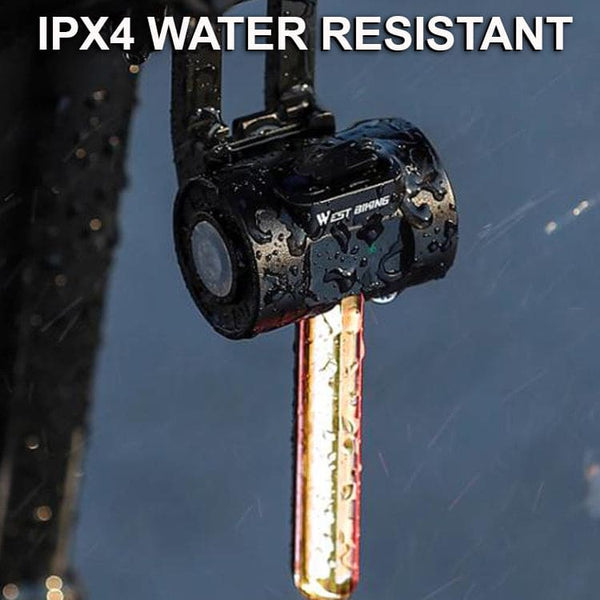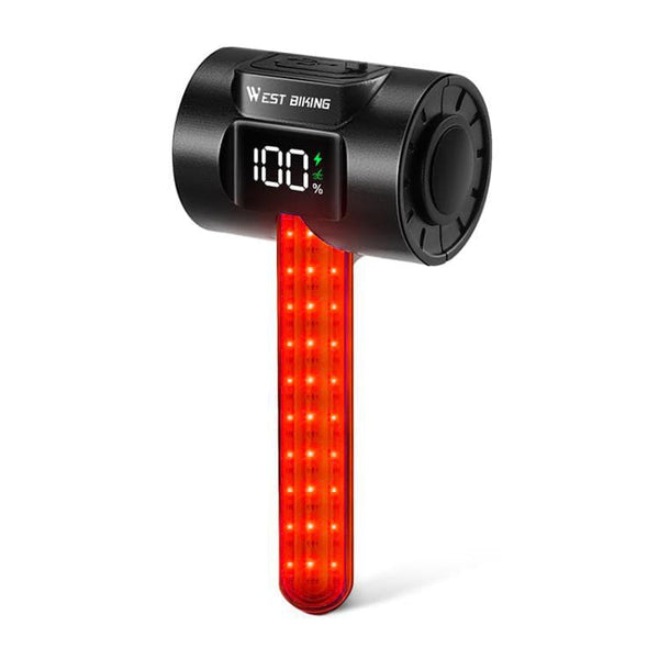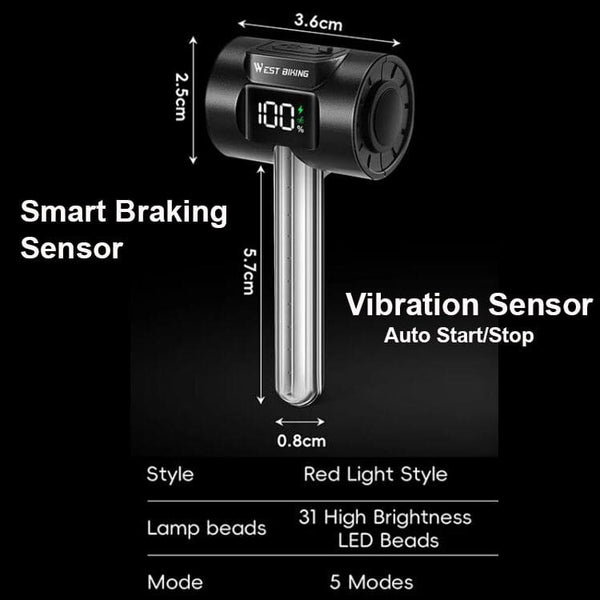 The WEST BIKING Smart Sensor Bike Tail Light is a revolutionary safety upgrade designed for modern cyclists, ensuring maximum visibility and peace of mind on every ride. Utilizing a high-brightness COB LED core and a massive 180-degree wide-angle design, this smart light cuts through the darkness and constantly reminds surrounding vehicles and cyclists of your presence. At the core of its intelligent operation is a dual-chip system featuring a highly sensitive Motion Sensor and an Ambient Light Sensor. This allows the light to automatically adjust output for energy saving and instantly wake from auto-sleep upon sensing vibration when you start moving. The light boasts a powerful Brake Sensing function that instantly triggers a saturated, full-coverage red light when deceleration is detected. Designed for convenience and durability, it has a real-time digital display that shows the exact battery percentage and the current mode. Rated IPX4 water resistant, it remains resilient against rain and daily weather impacts. Charging is simple and fast thanks to the universal Type-C port, and a mode memory function ensures it always restarts in your last-used setting. The package includes two dedicated mounting brackets, offering versatile installation options for both saddle rails and seat posts. With 5 distinct light modes and a potent 400mAh battery, this WEST BIKING tail light is the essential piece of gear for safer, smarter cycling. Main Features & Specs