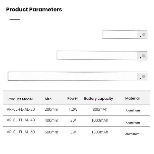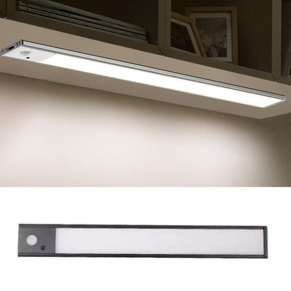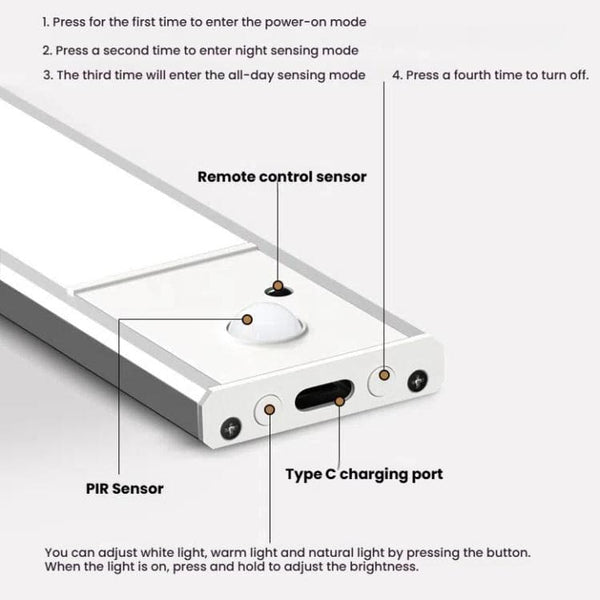 The Rechargeable Motion Sensor Light Bar is the ultimate solution for illuminating dark spaces in your home, such as kitchen cabinets, wardrobes, closets, and hallways. Customize your lighting experience with three adjustable color temperatures: warm, neutral and cool white. Use the buttons or remote control to effortlessly cycle through these color modes, adjust brightness levels, and set your preferred operating mode. Engineered for optimal convenience, the light bar has rechargeable battery, eliminating the need for constant battery replacements. The battery can last for an impressive 1-2 months before requiring a recharge, making it an incredibly low-maintenance lighting option. Installation is simple and requires no tools or wiring thanks to its versatile mounting system. The light bar can be mounted using the adhesive metal strip (included), magnetically attached to metal surfaces, or used as a handheld light. Constructed from sleek, durable aluminum, this wireless light is designed to provide powerful and flicker-free illumination while maintaining a clean, modern aesthetic. Available in 3 different lengths and black or silver colours Main Features